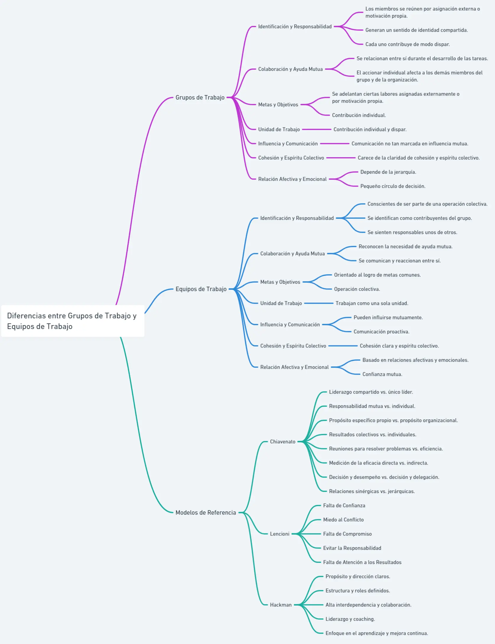 En el siguiente mapa mental se sintetizan las principales diferencias entre los grupos y equipos de trabajo (clic para ver imagen en tamaño completo):