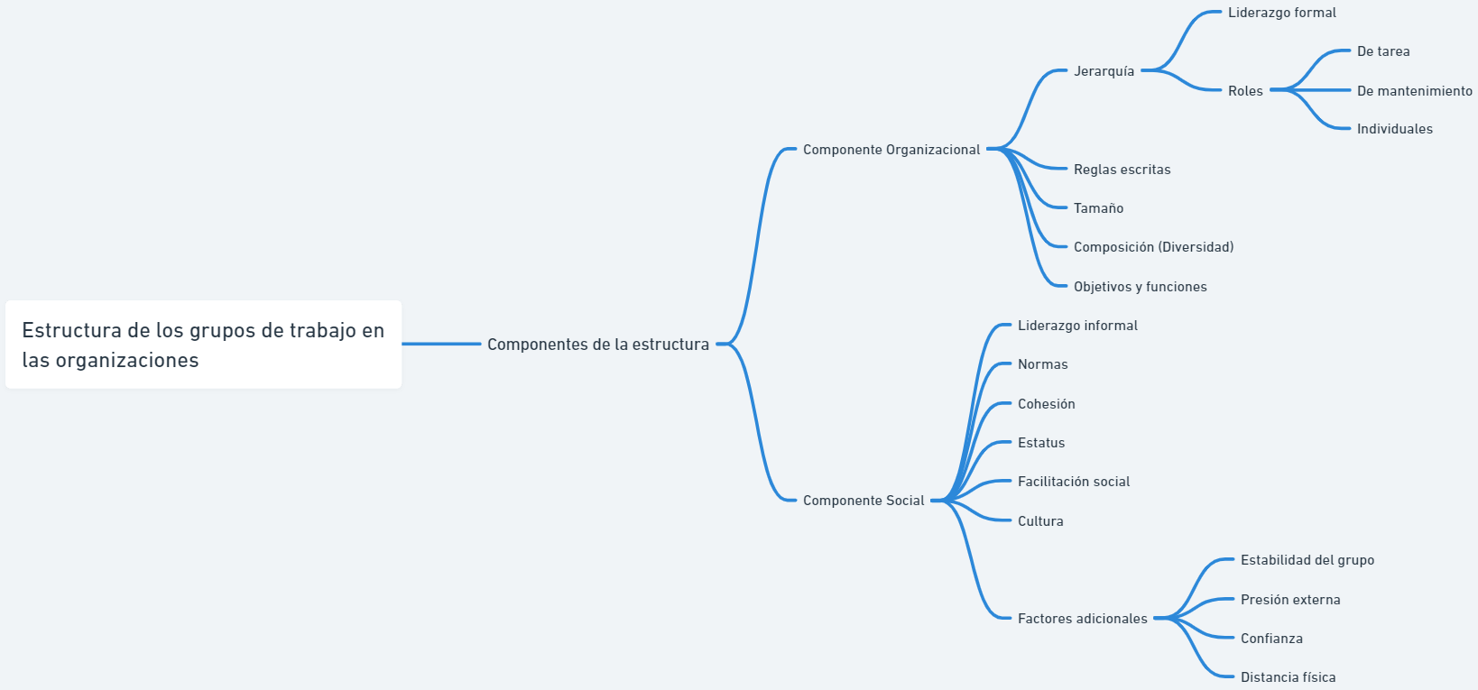 Para terminar, el siguiente mapa mental resume el concepto de la estructura de los grupos de trabajo en las organizaciones y sus componentes. Esperamos que te resulte de utilidad para hacerte una idea general del tema: